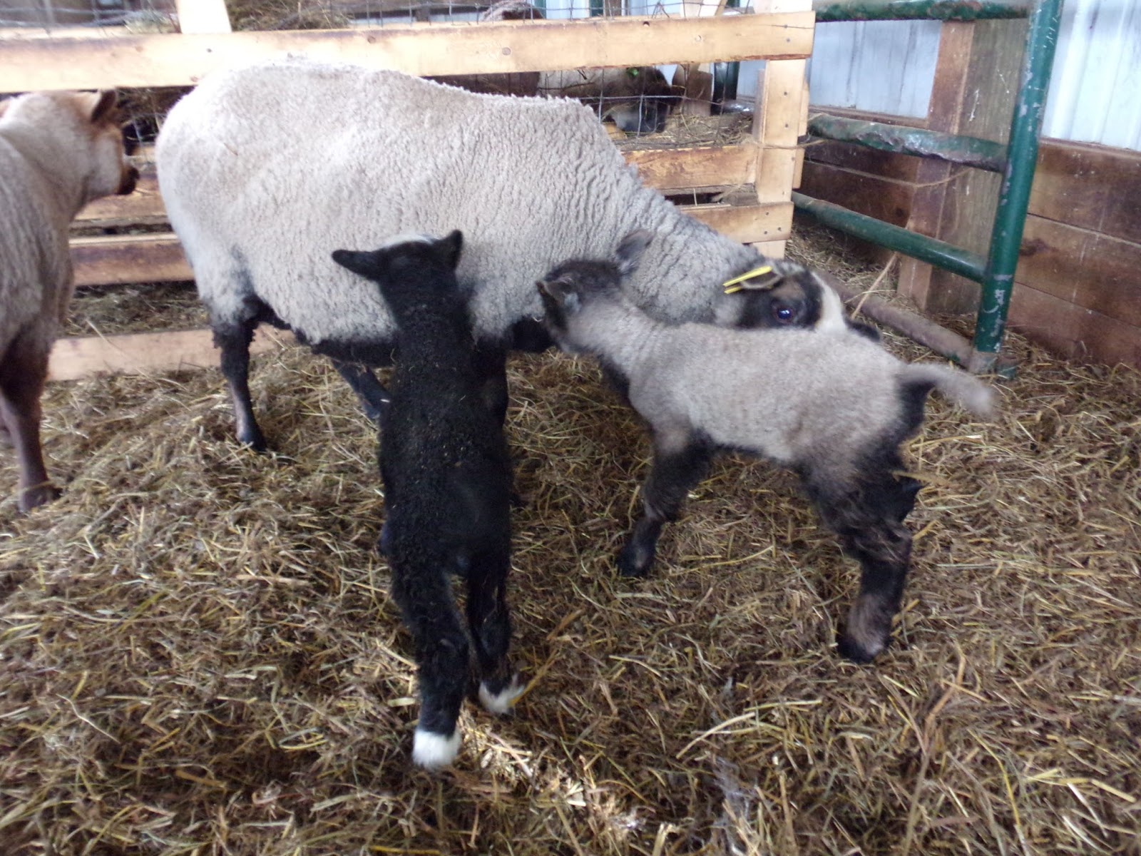 Jasmine also had delivered these two beautiful little ewes a little earlier as they were already dry and had nursed. A grey Katmoget on the right and a Black krunet with some white socks.